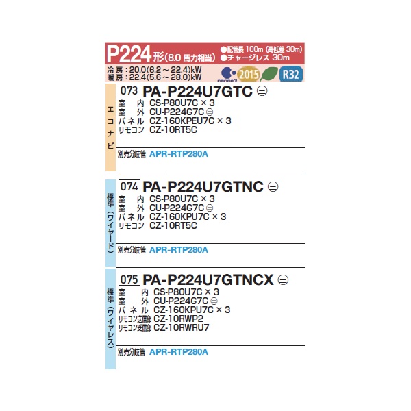 パナソニック 『PA-P224U7GTNCX+分岐管』 業務用エアコン 4方向天井カセット形 標準(ワイヤレス) 同時トリプル P224 形8.0馬力 三相200V ♪