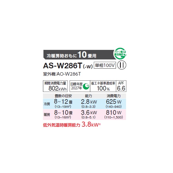 ゼネラル AS-W286T エアコン 10畳 ルームエアコン Wシリーズ ノクリア 単相100V 10畳程度 (AS-W285S の後継品)