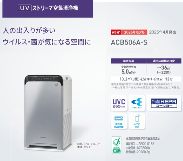ダイキン ACB506A-S UVストリーマ空気清浄機 本体:ホワイト 前面パネル:シルバー 22畳 (ACB50Z-Sの後継品) 【個人後払いNG】