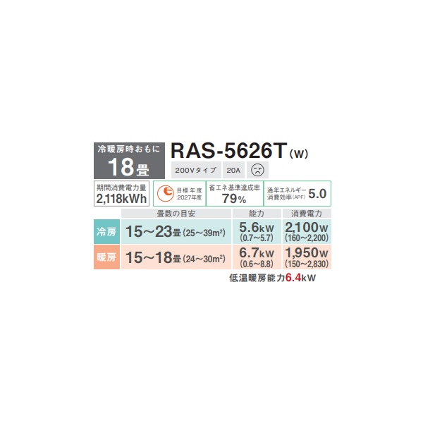 日本キヤリア/旧東芝 RAS-5626T(W) エアコン 18畳用 ルームエアコン Tシリーズ 単相200V 18畳程度 ホワイト (RAS-5625T-Wの後継品) [戻る]