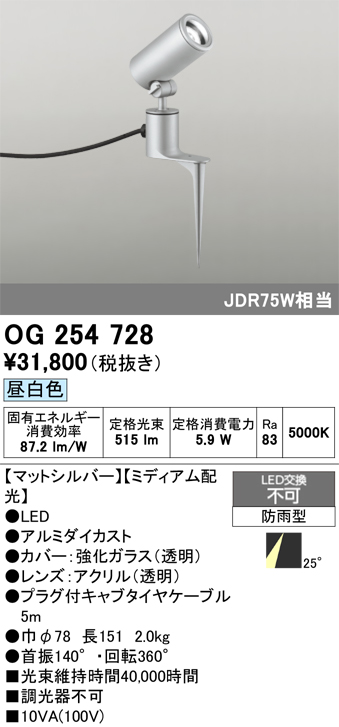 オーデリック OG254728 エクステリアスポットライト LED一体型 昼白色 ミディアム配光 防雨型 マットシルバー