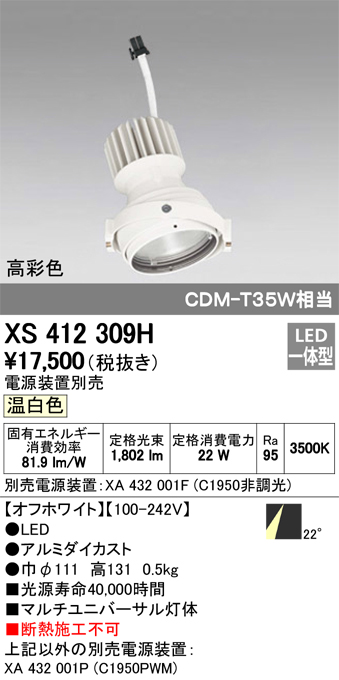 オーデリック XS412309H スポットライト LED一体型 温白色 高彩色 電源装置・調光器・信号機別売 22° ホワイト 断熱施工不可