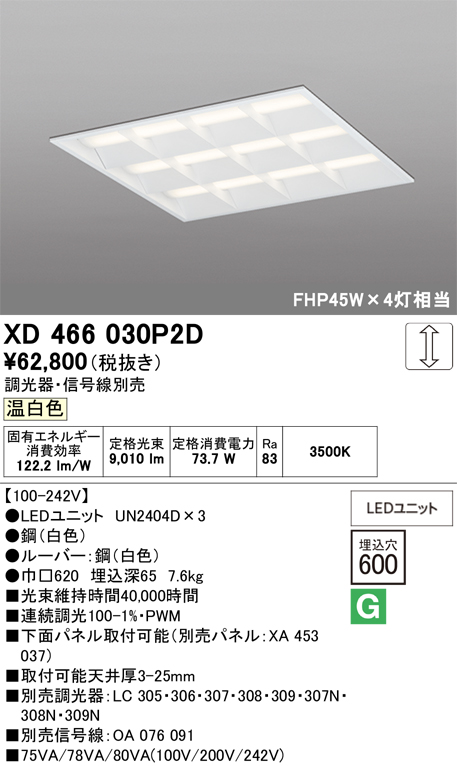 オーデリック XD466030P2D(LED光源ユニット別梱) ベースライト LEDユニット型 埋込型 PWM調光 温白色 調光器・信号線別売 ルーバー付