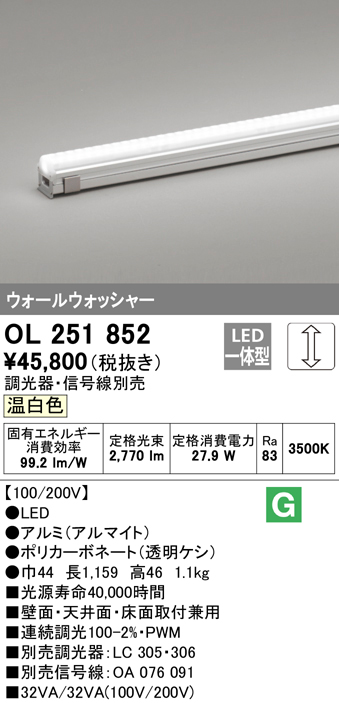 オーデリック OL251852 間接照明 LED一体型 温白色 配光制御タイプ 調光 調光器・信号線別売 ランプ交換不可 1159mm