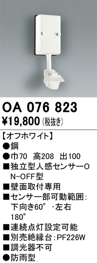 照明部材 オーデリック OA076823 屋外用独立型センサ 人感センサ ON-OFF型 壁面用 オフホワイト 防雨型