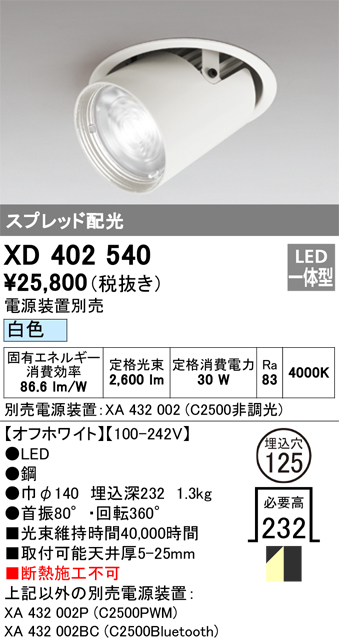 オーデリック XD402540 ダウンスポットライト LED一体型 白色 電源装置別売 埋込穴φ125 オフホワイト