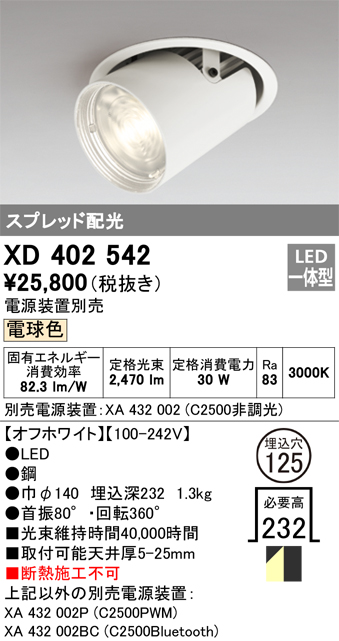 オーデリック XD402542 ダウンスポットライト LED一体型 電球色 電源装置別売 埋込穴φ125 オフホワイト
