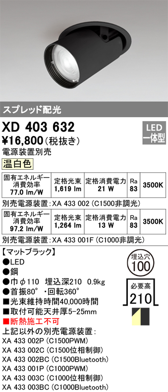 オーデリック XD403632 ダウンスポットライト LED一体型 温白色 電源装置別売 埋込穴φ100 ブラック