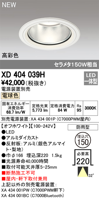 オーデリック XD404039H ダウンライト LED一体型 電球色 銀色コーン 電源装置別売 防雨型 埋込穴φ150 オフホワイト