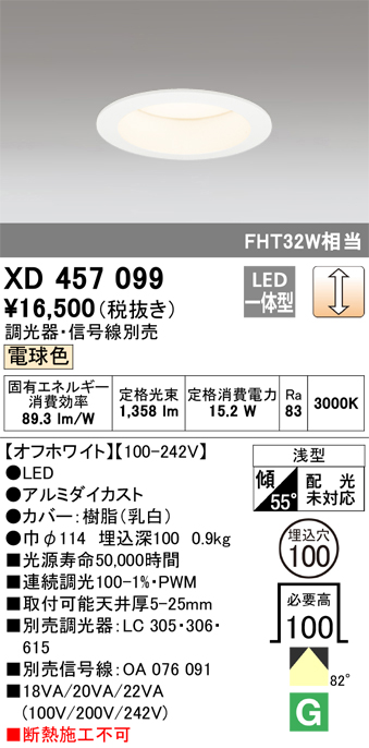オーデリック XD457099 ダウンライト LED一体型 連続調光 電球色 調光器・信号線別売 浅型 埋込穴φ100 オフホワイト