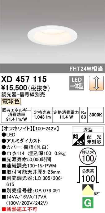 オーデリック XD457115 ダウンライト LED一体型 連続調光 電球色 調光器・信号線別売 浅型 埋込穴φ100 オフホワイト