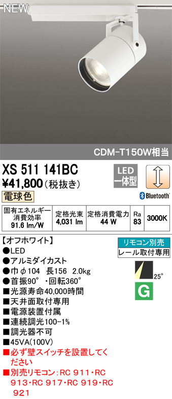 オーデリック XS511141BC スポットライト LED一体型 Bluetooth 調光 電球色 リモコン別売 25°ミディアム 白