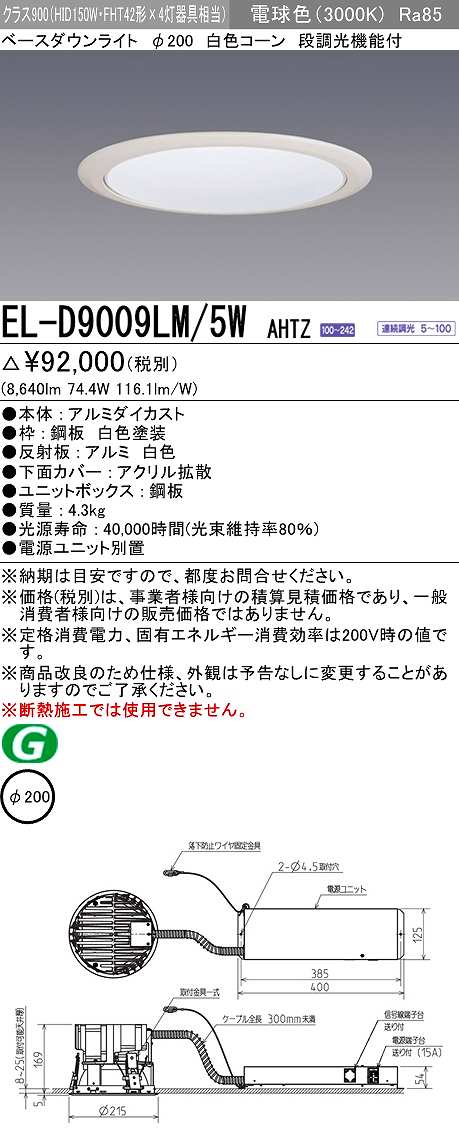 三菱 EL-D9009LM/5WAHTZ LEDダウンライト 拡散シリーズ 一般用途 段調光機能付調光5〜100% 電球色 φ200 電源ユニット別置 受注生産品 [§]