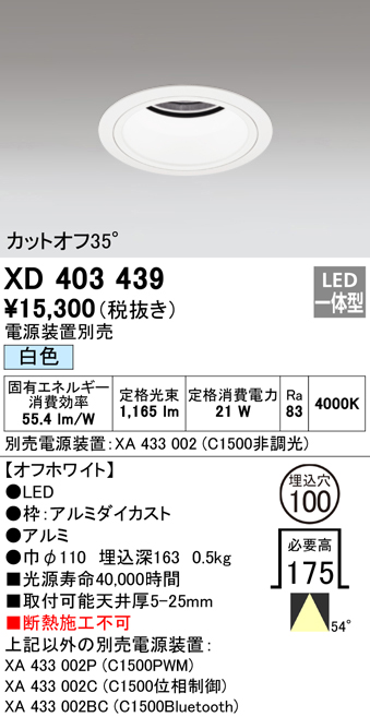 オーデリック XD403439 ベースダウンライト 深型 LED一体型 白色 電源装置別売 オフホワイト