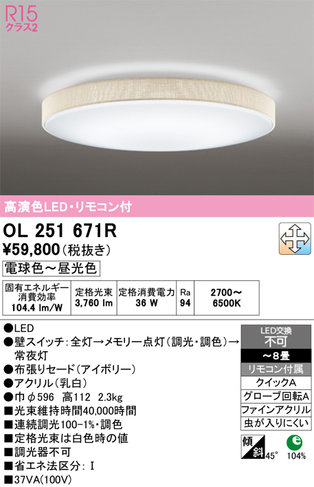 オーデリック OL251671R シーリングライト 8畳 調光 調色 リモコン付属 LED一体型 電球色〜昼光色 アイボリー [♭]