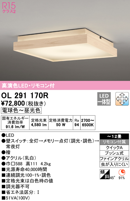 オーデリック OL291170R シーリングライト 12畳 調光 調色 リモコン付属 和風 LED一体型 電球色〜昼光色 檜 [♭]