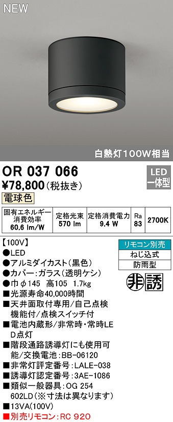 オーデリック OR037066 非常灯 誘導灯 リモコン別売 直付型 LED一体型 電球色 電池内蔵形 防雨形 ブラック [戻る]