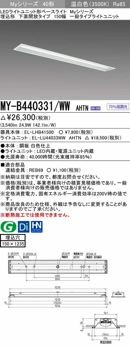三菱 MY-B440331/WW AHTN LEDライトユニット形ベースライト埋込形 下面開放 150幅 一般タイプ 固定出カ 温白色 受注生産品 [§]