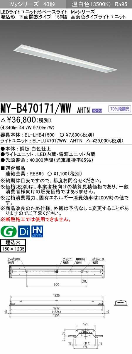 三菱 MY-B470171/WW AHTN LEDライトユニット形ベースライト 埋込形 下面開放 150幅 高演色タイプ(Ra95) 固定出カ 温白色 受注生産品 [§]
