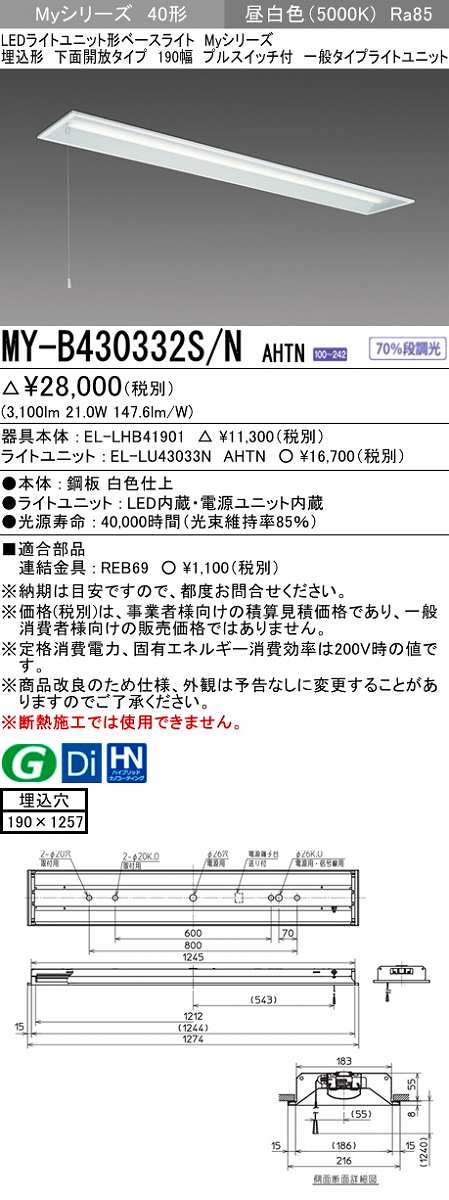 三菱 MY-B430332S/N AHTN LEDライトユニット形ベースライト 埋込形 下面開放 190幅 プルスイッチ付 一般タイプ 固定出カ 昼白色 受注生産品