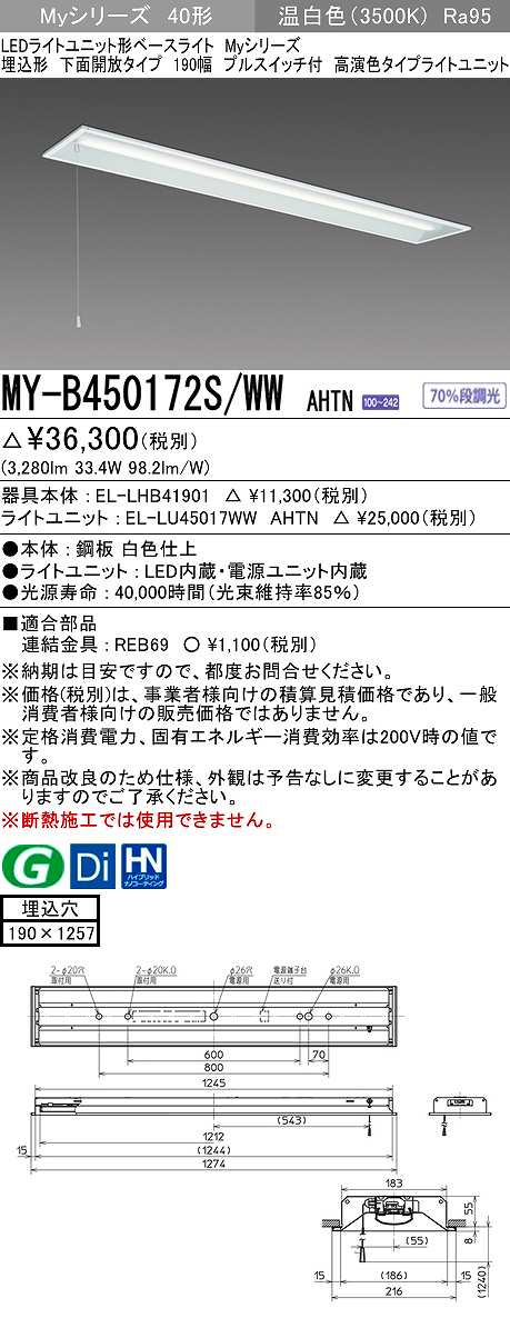 三菱 MY-B450172S/WW AHTN LEDライトユニット形ベースライト 埋込形 下面開放 190幅 プルスイッチ付 高演色タイプ(Ra95) 固定出カ 温白色 受注生産品 [§] [戻る]