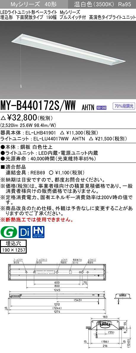三菱 MY-B440172S/WW AHTN LEDライトユニット形ベースライト 埋込形 下面開放 190幅 プルスイッチ付 高演色タイプ(Ra95) 固定出カ 温白色 受注生産品 [§] [戻る]