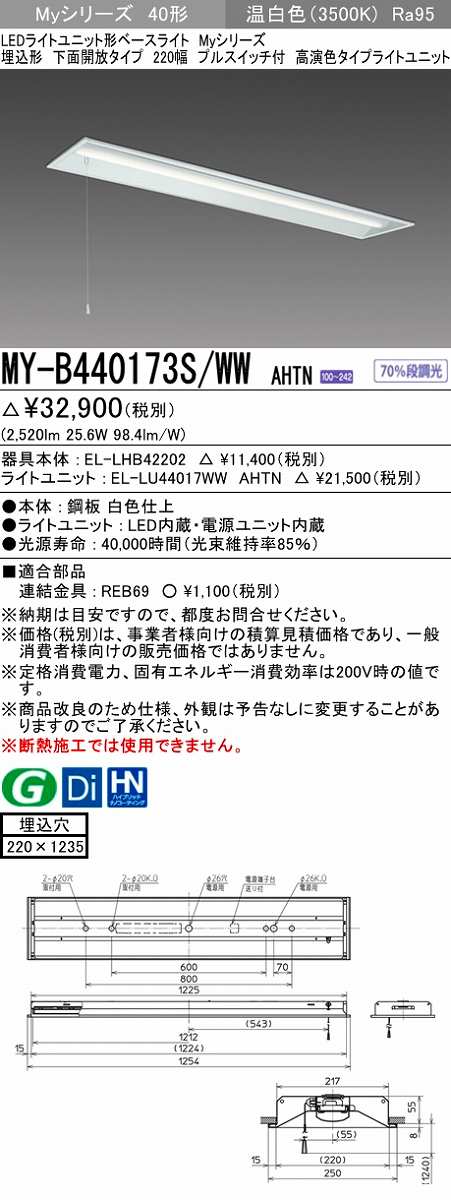 三菱 MY-B440173S/WW AHTN LEDライトユニット形ベースライト 埋込形下面開放 220幅プルスイッチ付 高演色タイプ(Ra95) 固定出力 温白色 受注生産品 [§] [戻る]