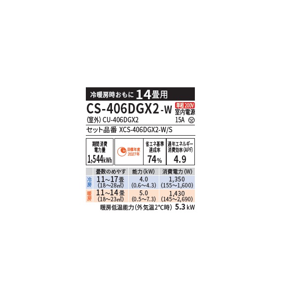 パナソニック CS-406DGX2-W エアコン 14畳 ルームエアコン GXシリーズ エオリア ナノイーX 単相200V 14畳程度 クリスタルホワイト (CS-405DGX2-Wの後継品) [cs-406dgx2-w]