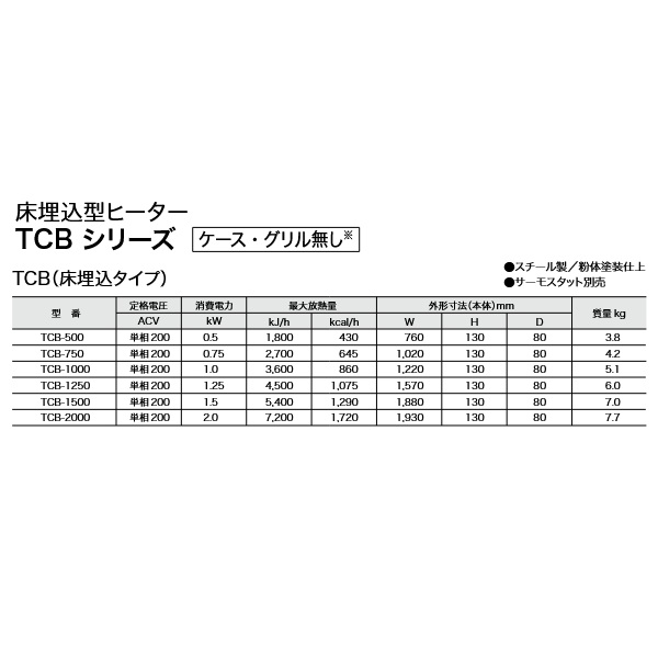 インターセントラル TCB-500 床埋込型ヒーター 自然対流式ペリメーター用ヒーター 床埋込タイプ ケース・グリル無し 単相200V W760×H130×D80 受注生産 §♪ [tcb-500]