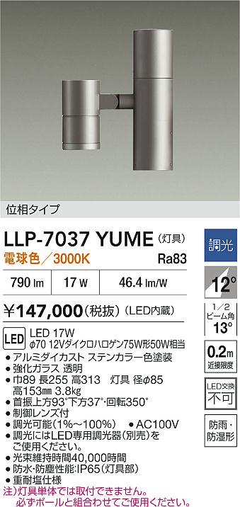 大光電機(DAIKO) LLP-7037YUME アウトドアライト ポールスポットライト 調光(調光器別売) 電球色 灯具本体 LED内蔵 ポール別売 防雨・防湿型 ステンカラー [llp-7037yume]