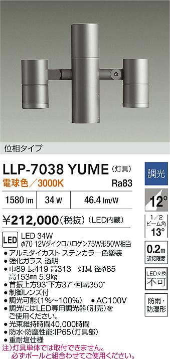 大光電機(DAIKO) LLP-7038YUME アウトドアライト ポールスポットライト 調光(調光器別売) 電球色 灯具本体 LED内蔵 ポール別売 防雨・防湿型 ステンカラー