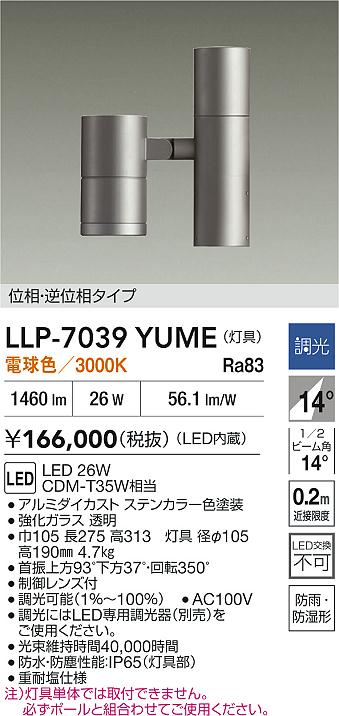 大光電機(DAIKO) LLP-7039YUME アウトドアライト ポールスポットライト 調光(調光器別売) 電球色 灯具本体 LED内蔵 ポール別売 防雨・防湿型 ステンカラー [llp-7039yume]