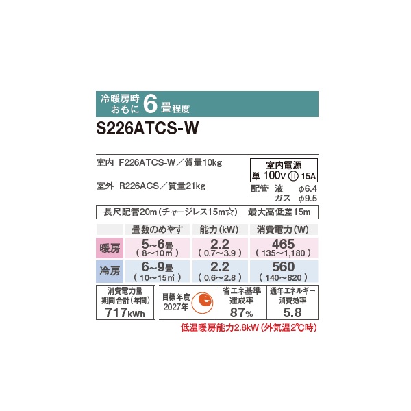 ダイキン S226ATCS-W エアコン 6畳 ルームエアコン CXシリーズ 単相100V 15A 6畳程度 ホワイト (S225ATCS-W 後継品) ♪ [s226atcs-w]