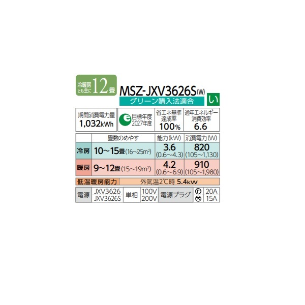 型番:MSZ-JXV3626S-W / MSZ-JXV3626S / MSZJXV3626S