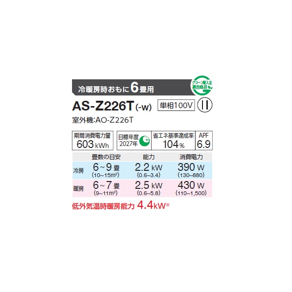 ゼネラル AS-Z226T エアコン 6畳 ルームエアコン Zシリーズ ノクリア 単相200V 6畳程度 (AS-Z225S の後継品)