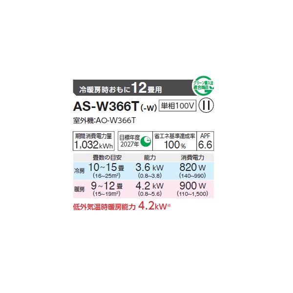 ゼネラル AS-W366T エアコン 12畳 ルームエアコン Wシリーズ ノクリア 単相100V 12畳程度 (AS-W365S の後継品) [as-w366t]
