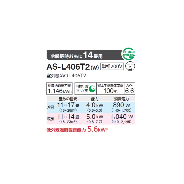 ゼネラル AS-L406T2 エアコン 14畳 ルームエアコン Lシリーズ ノクリア 単相200V 14畳程度 (AS-L405S2 の後継品)