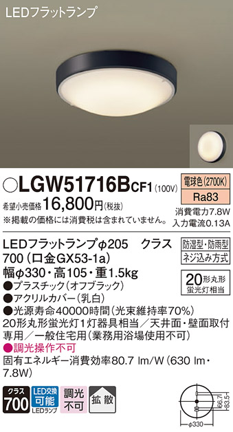 パナソニック LGW51716BCF1 シーリングライト 天井・壁直付型 LED(電球色) 拡散 防湿・防雨型 ネジ込み方式 オフブラック