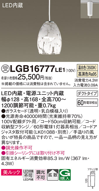 パナソニック LGB16777LE1 ペンダント 吊下型 LED(温白色) 美ルック ガラスセード 拡散 ダクトタイプ [lgb16777le1]