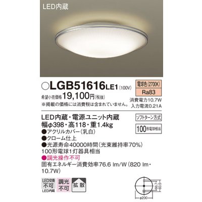 パナソニック LGB51616LE1 シーリングライト 天井直付型LED(電球色) 100形電球1灯器具相当 拡散タイプ ホワイト [lgb51616le1]