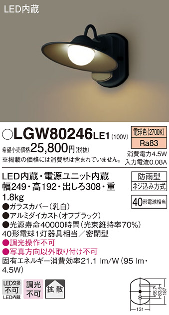 照明器具 パナソニック LGW80246LE1 ポーチライト 壁直付型 LED 電球色 密閉型 防雨型 オフブラック [lgw80246le1]