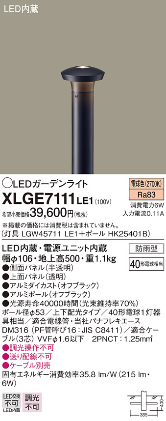 パナソニック XLGE7111LE1 ガーデンライト LED(電球色) 40形電球1灯器具相当 上下配光タイプ防雨型 ブラック