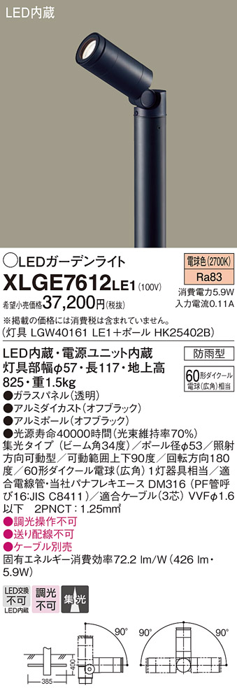 パナソニック XLGE7612LE1 ガーデンライト LED(電球色) 60形ダイクール電球(広角)1灯器具相当 集光タイプ防雨型 ブラック