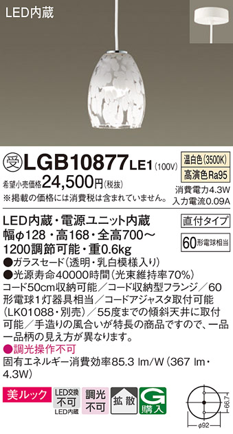 パナソニック LGB10877LE1 ダイニング用ペンダント 直付吊下型LED(温白色) ガラスセード 拡散 乳白模様 [lgb10877le1]