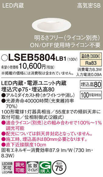 パナソニック LSEB5804LB1 ダウンライト 天井埋込型 LED(温白色) 浅型8H・高気密SB形・調光(ライコン別売) 埋込穴φ75 [lseb5804lb1]