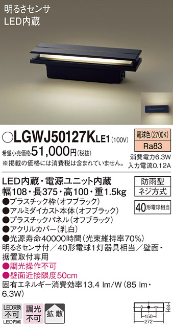 パナソニック LGWJ50127KLE1 門柱灯・門袖灯 壁直付型・据置取付型 LED(電球色) 拡散タイプ 防雨型・明るさセンサ付 パネル付型