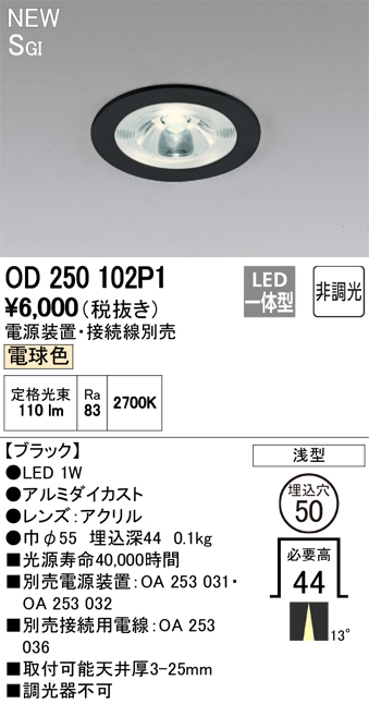 オーデリック OD250102P1 ダウンライト LED一体型 非調光 電球色 電源装置・接続線別売 浅型 埋込穴φ50 ブラック [od250102p1]