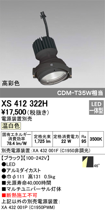 オーデリック XS412322H スポットライト LED一体型 温白色 高彩色 電源装置・調光器・信号機別売 46° ブラック 断熱施工不可