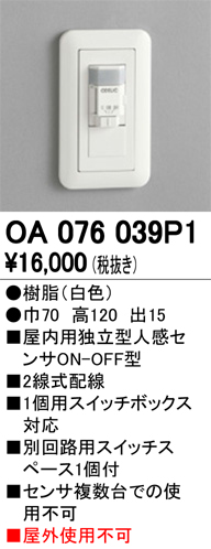 オーデリック OA076039P1 照明部材 センサユニット壁埋込 ホワイト