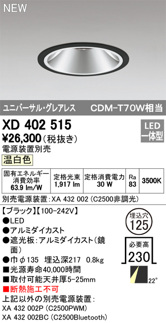 オーデリック XD402515 ユニバーサルダウンライト LED一体型 温白色 電源装置別売 埋込穴φ125 ブラック [xd402515]